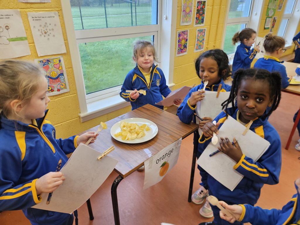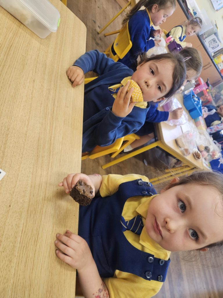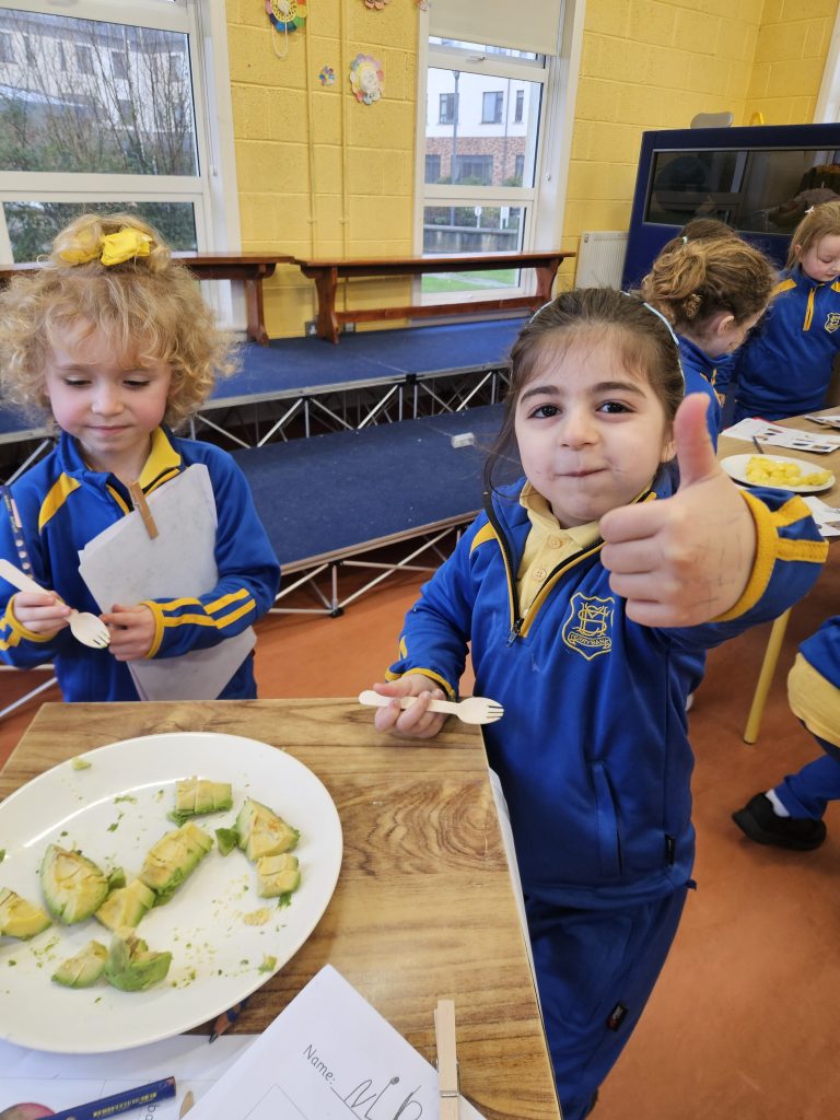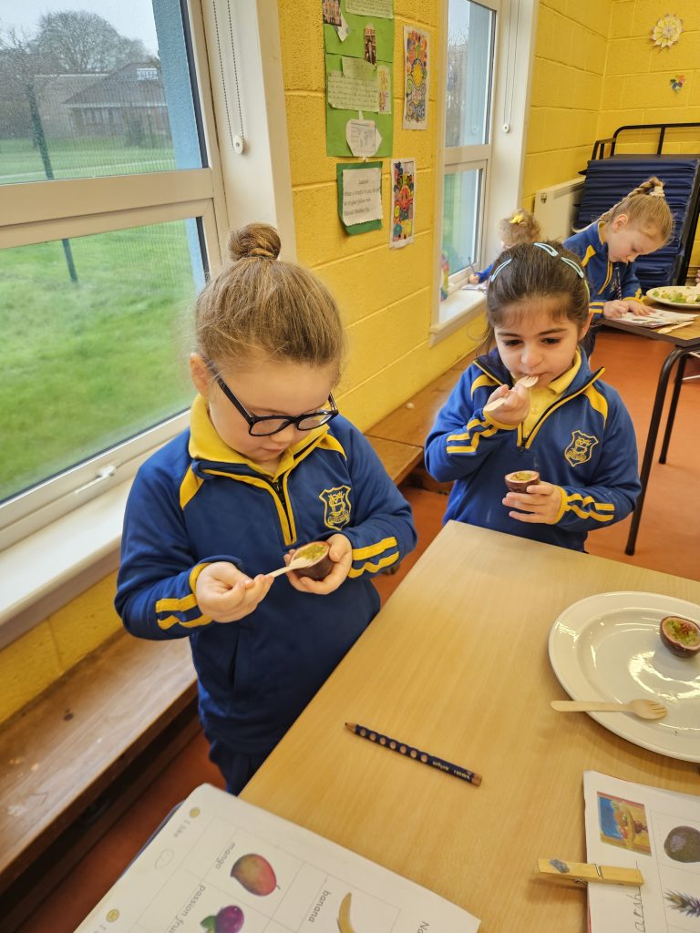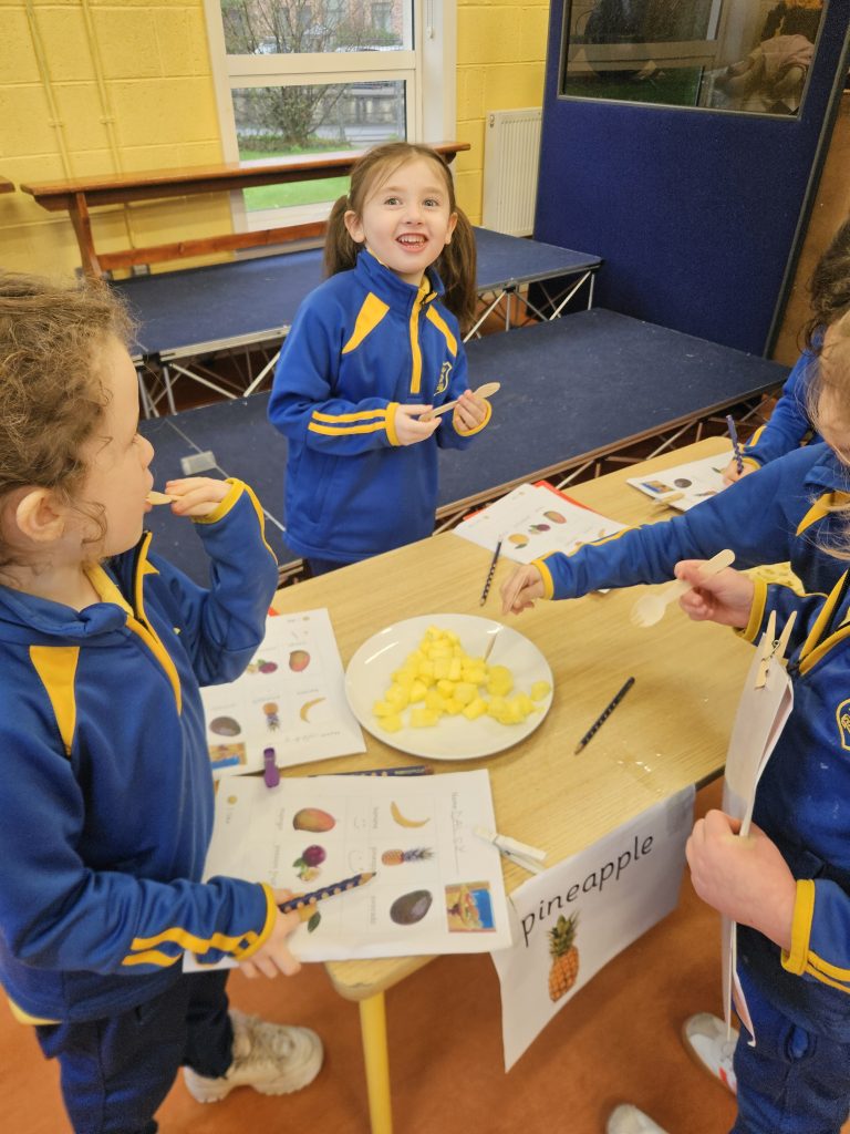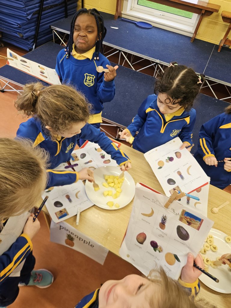 This month we have been learning all about food. We read the story Handa’s Surprise and we tasted some of the fruits from the story. Some of the girls had never tasted passion fruit, mango or avocado so there was great excitement. Out of the 6 fruits we tasted, most people preferred the pineapple.