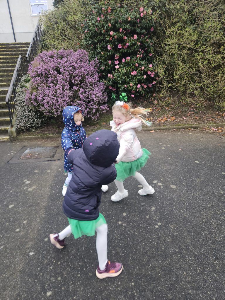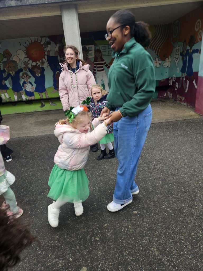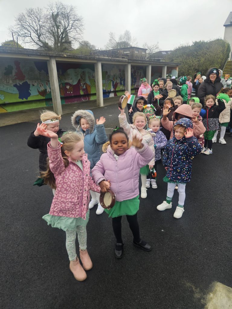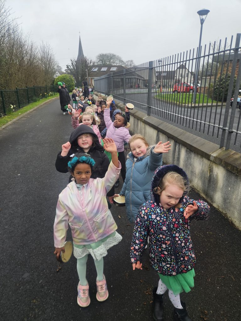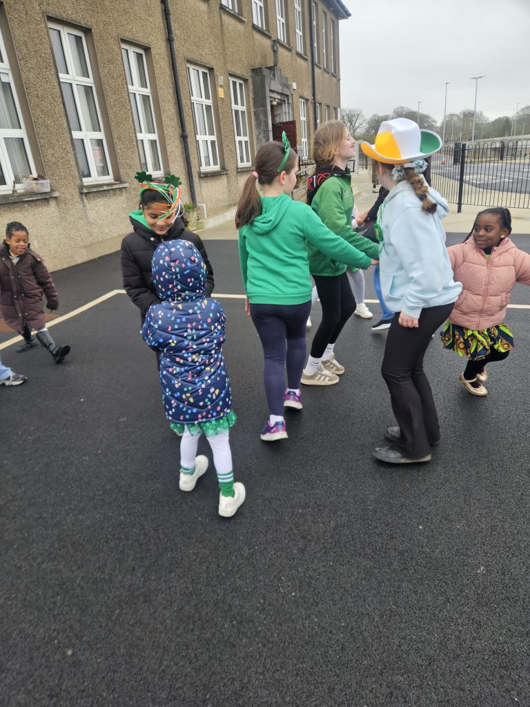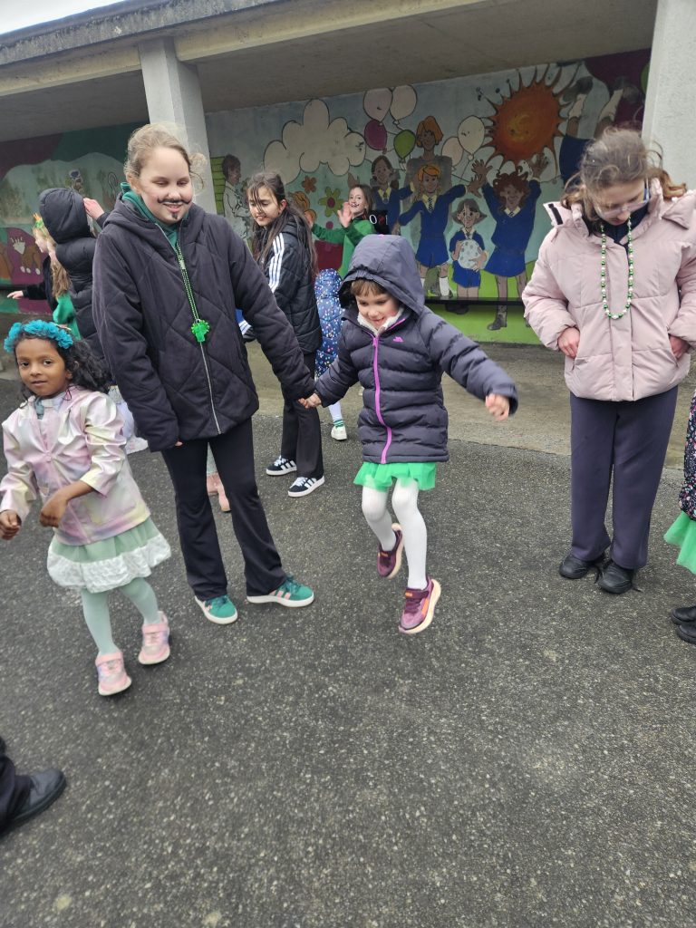 We had great fun today celebrating Saint Patrick’s Day. All the girls made a great effort to dress up in their colours for the day. We started with a parade up to Madonna House and the Little Sisters of the Poor where the girls sang and danced. When we arrived back to school we had a Céilí Mór with all the students and teachers. The girls did a wonderful job and had lots of fun, despite the weather. Well done to everyone and Happy St. Patrick’s Day!